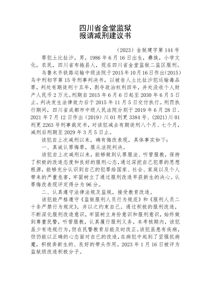 罪犯土比扯沙报请减刑建议书.doc