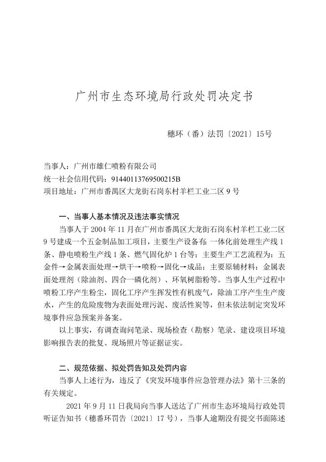 穗环(番)法罚〔2021〕15号 广州市雄仁喷粉有限公司.doc