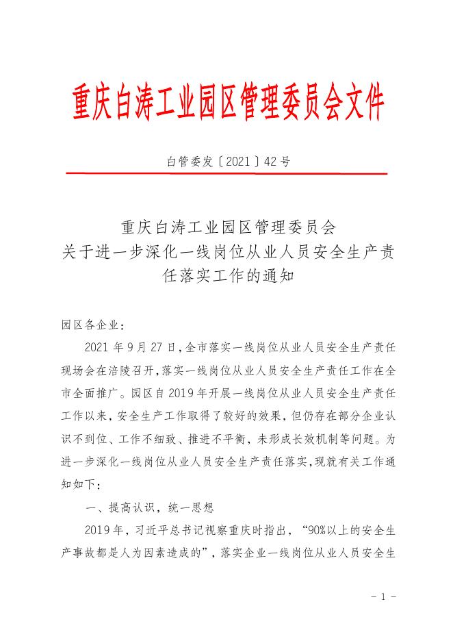 重庆白涛工业园区管理委员会关于进一步深化一线岗位从业人员安全生产责任落实工作的通知.doc