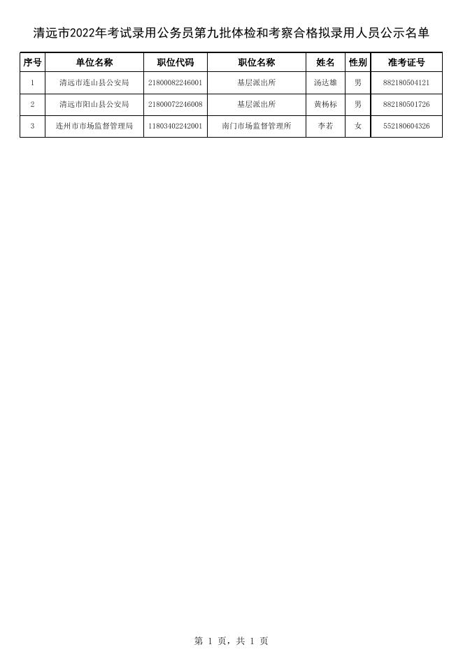 附件:清远市2022年考试录用公务员第九批体检和考察合格拟录用人员公示名单.xls