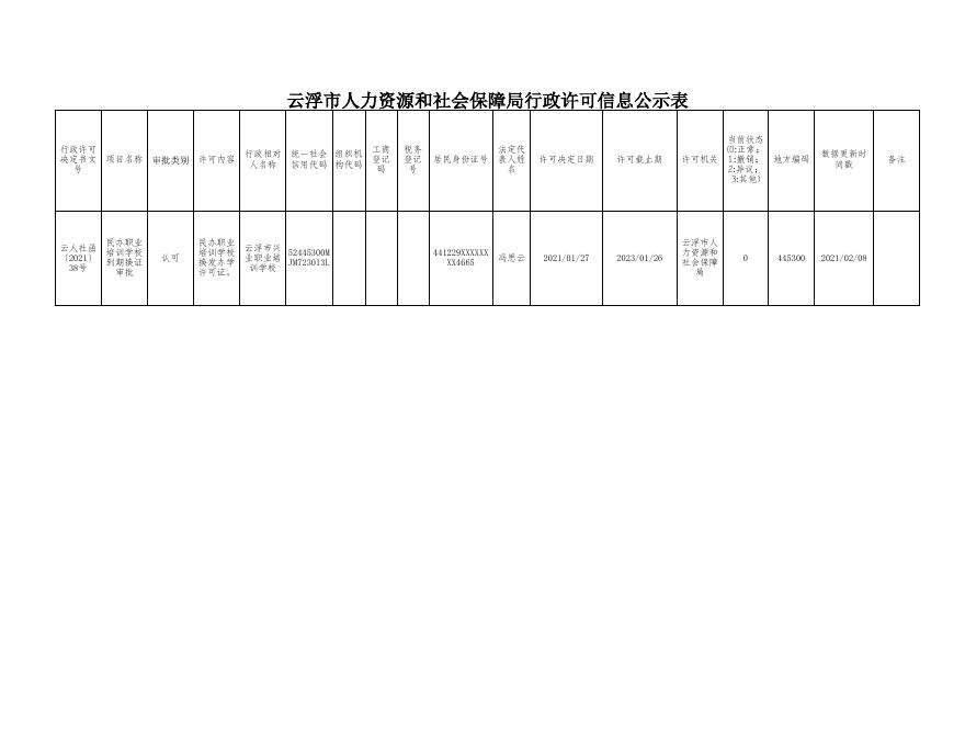 云浮市人力资源和社会保障局行政许可信息公示表(云浮市兴业职业培训学校申请换发办学许可证).xls