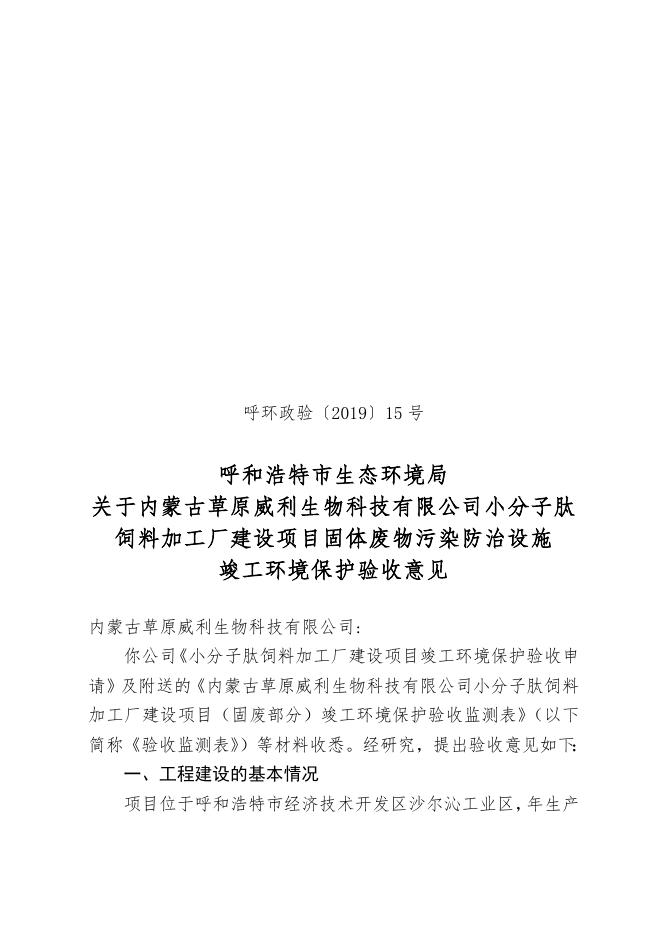 呼和浩特市生态环境局关于内蒙古草原威利生物科技有限公司小分子肽饲料加工厂建设项目固体废物污染防治设施竣工环境保护验收意见.doc