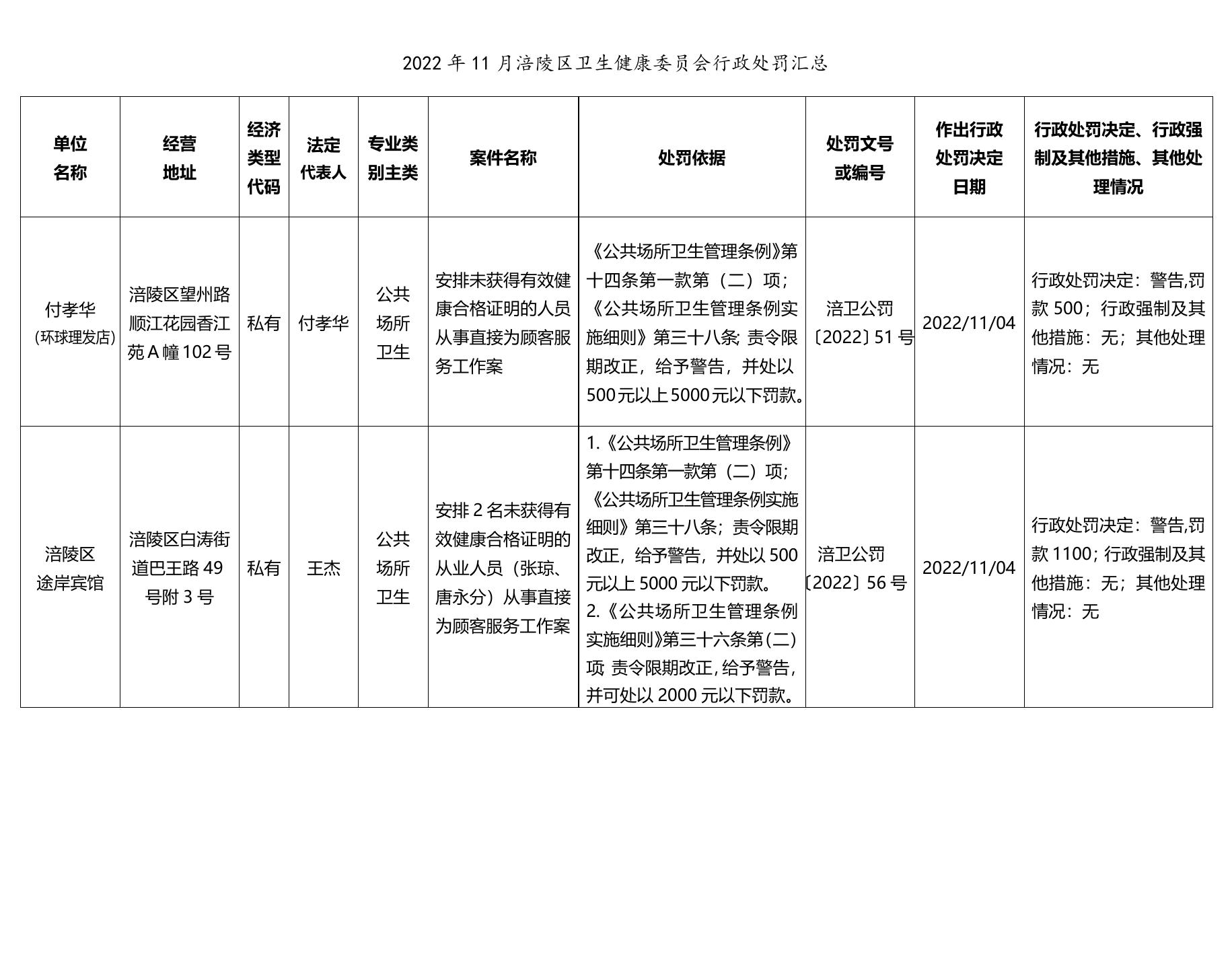 2022年11月涪陵区卫生健康委员会行政处罚汇总.docx