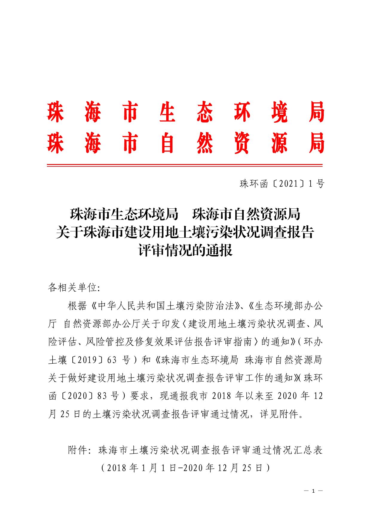珠海市生态环境局 珠海市自然资源局关于珠海市建设用地土壤污染状况调查报告评审情况的通报.pdf