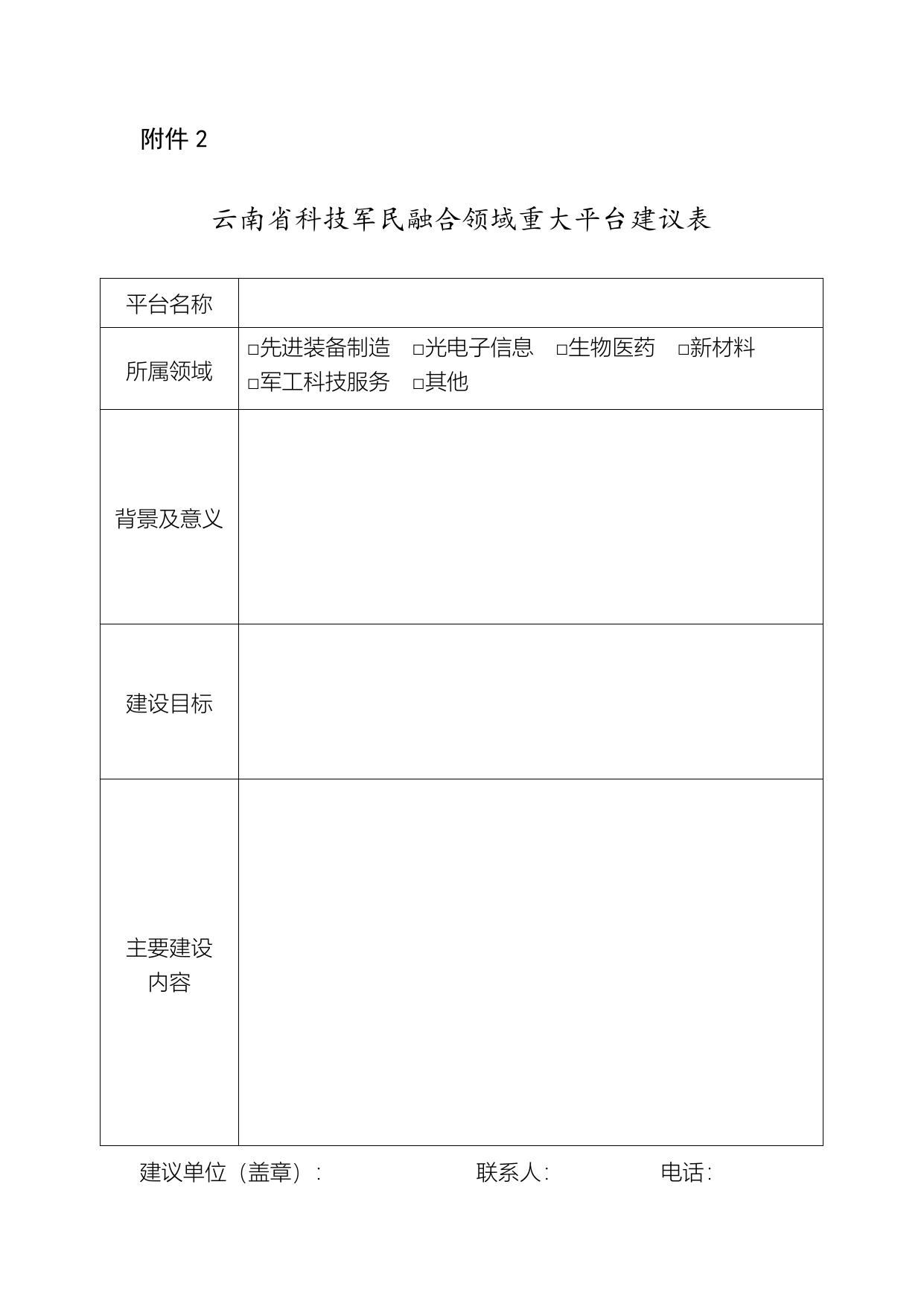 云南省科技军民融合领域重大平台建议表.doc