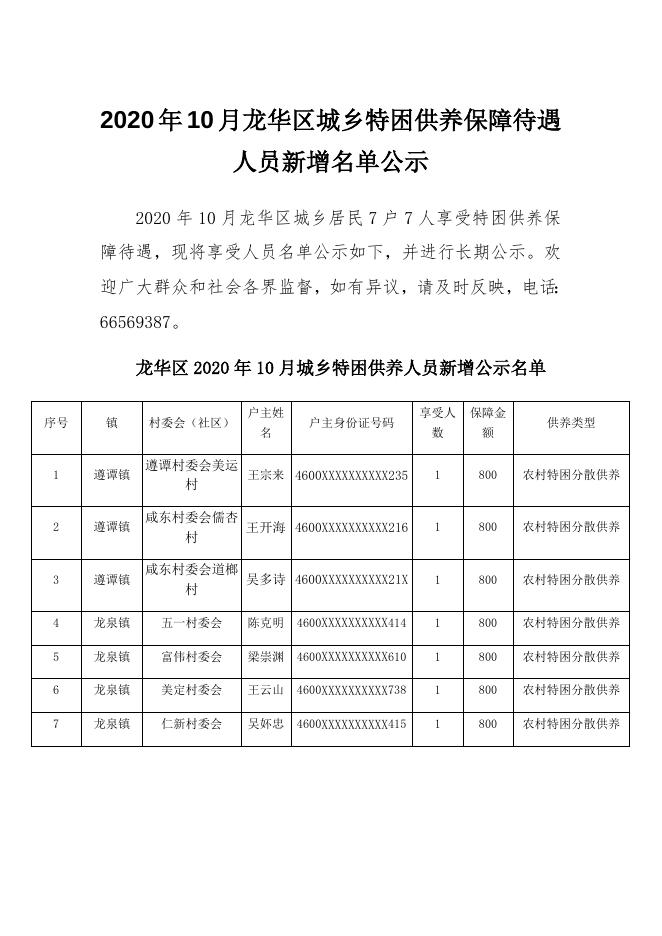 2020年10月龙华区城乡特困供养保障待遇人员新增名单公示.docx