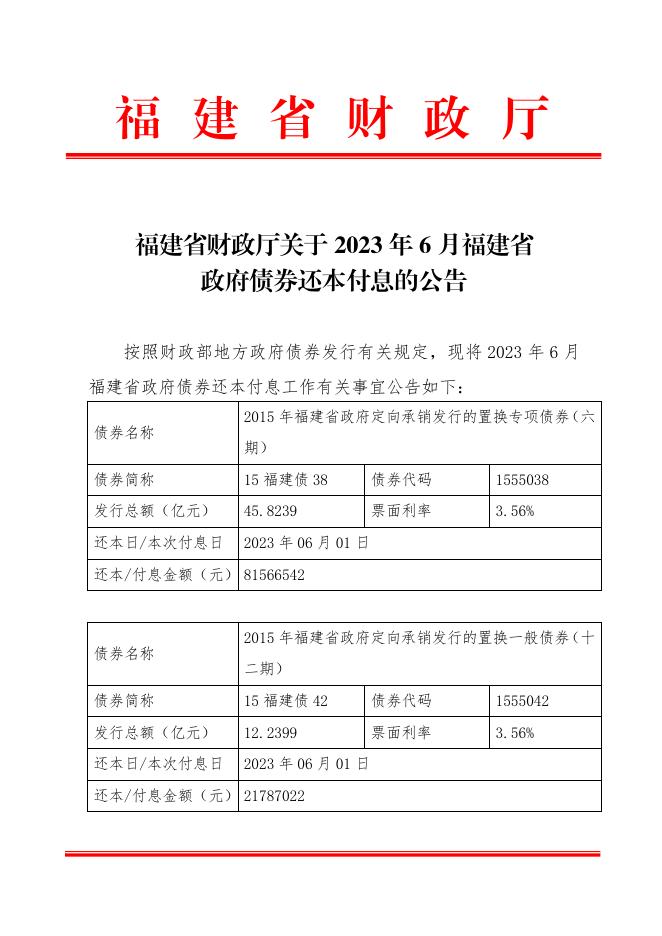 福建省财政厅关于2023年6月福建省政府债券还本付息的公告.pdf