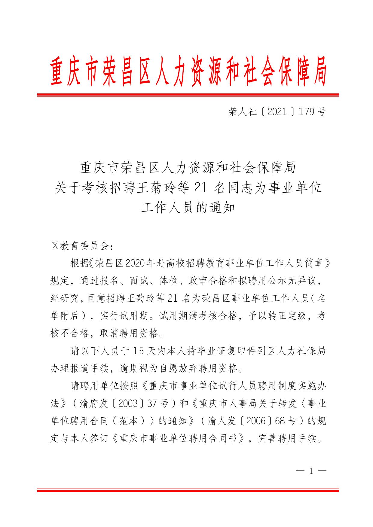 荣人社〔2021〕179号关于考核招聘王菊玲等21名同志为事业单位工作人员的通知(电子公文).doc