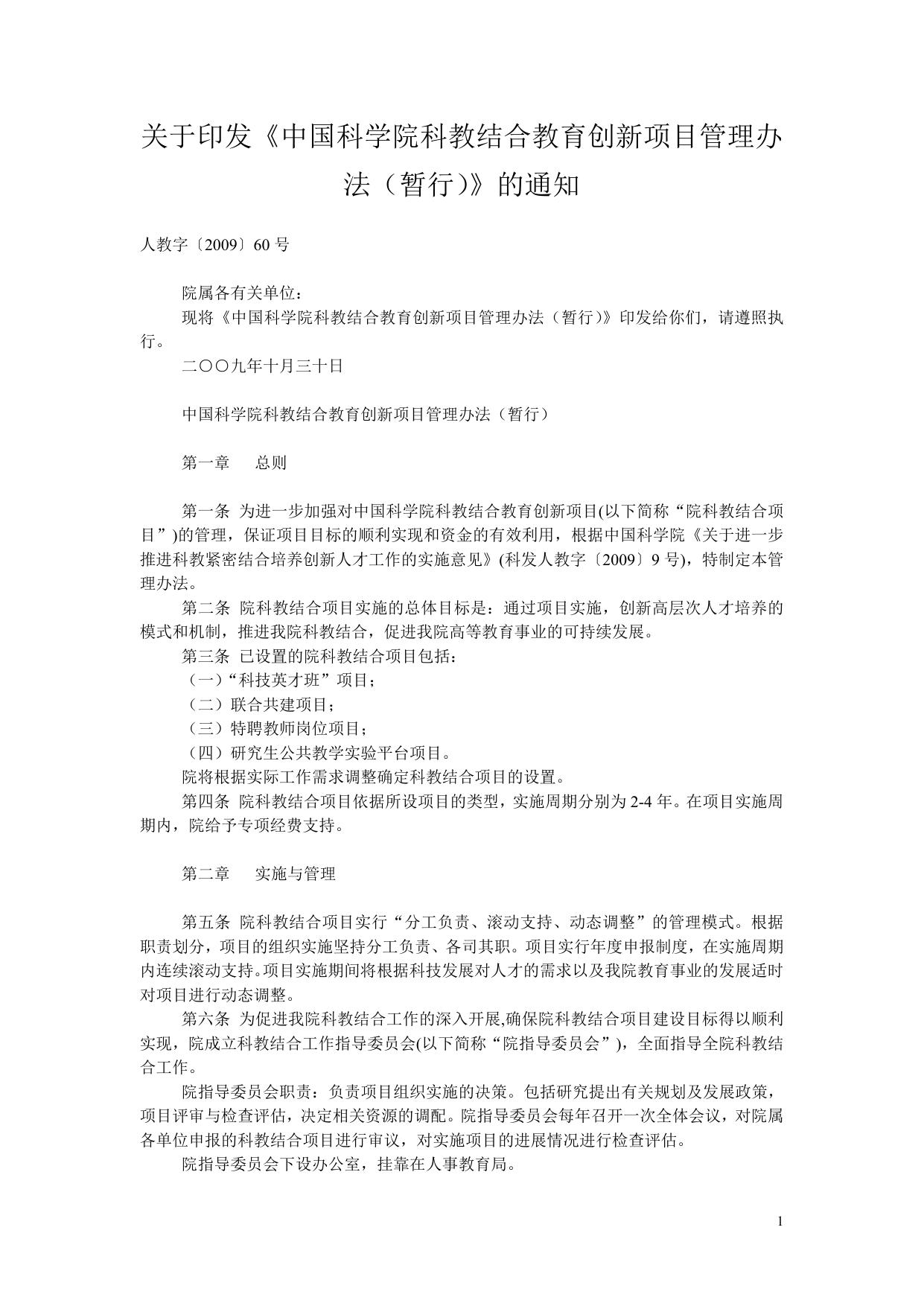 关于印发《中国科学院科教结合教育创新项目管理办法(暂行)》的通知 人教字〔2009〕60号.doc