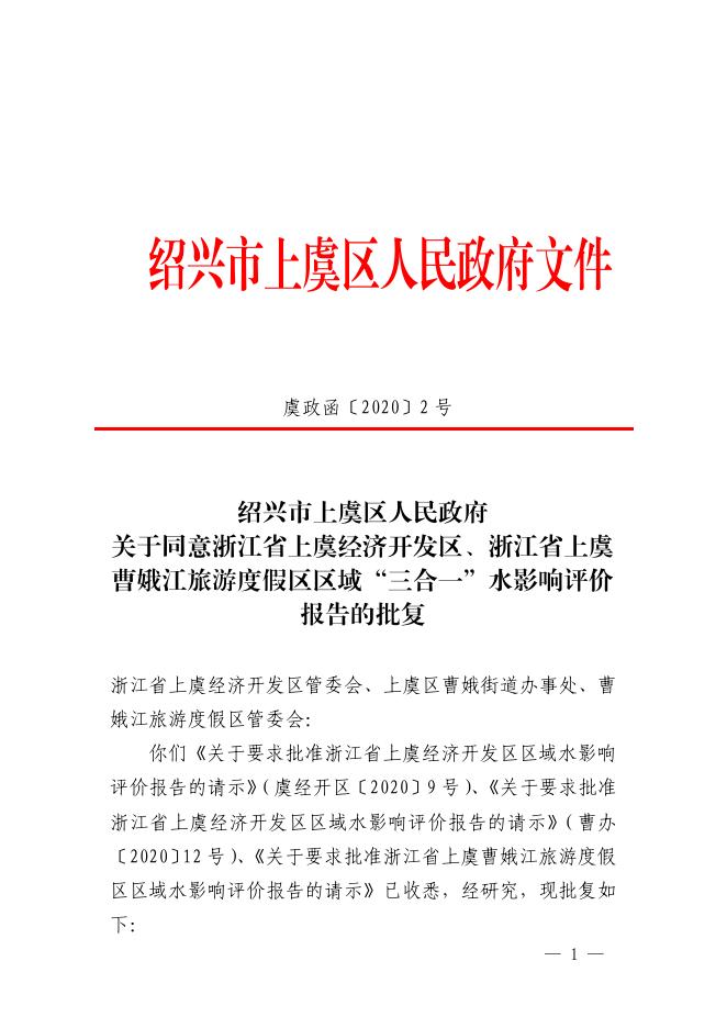 关于同意浙江省上虞经济开发区、浙江省上虞曹娥江旅游度假区区域“三合一”水影响评价报告的批复.pdf