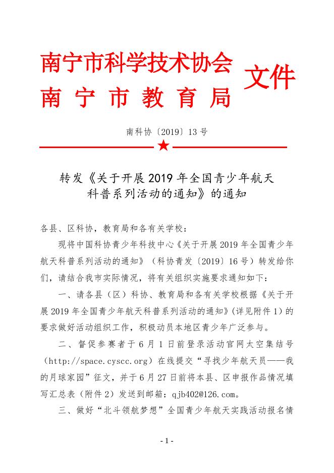 南科协〔2019〕13号文 转发《关于开展2019年全国青少年航天 科普系列活动的通知》的通知.doc