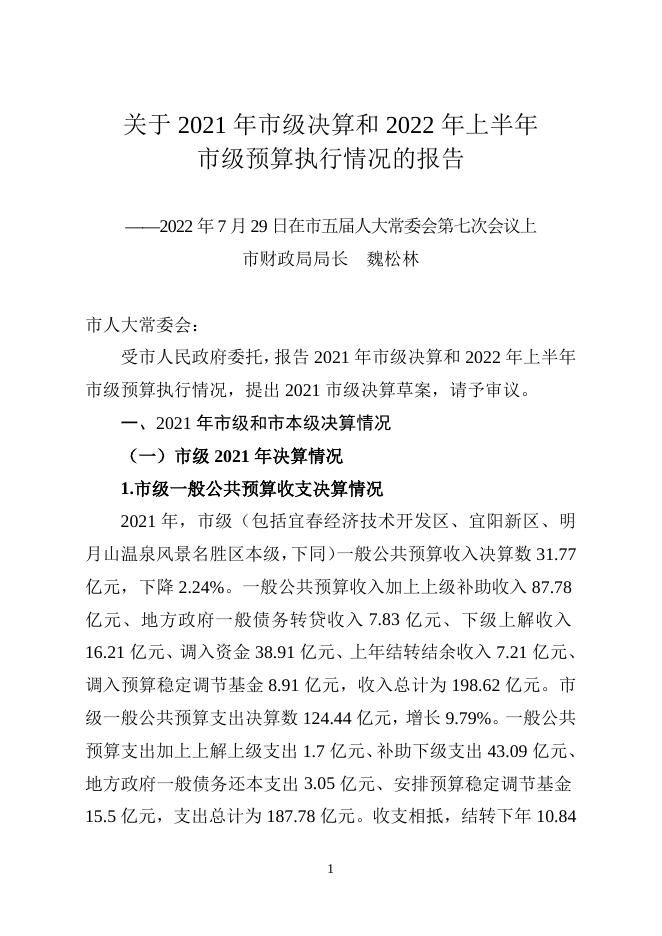 关于2021年市级决算和2022年上半年市级预算执行情况的报告.doc