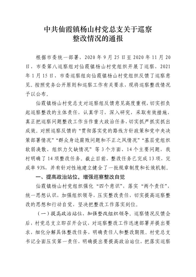 中共仙霞镇杨山村党总支关于巡察整改情况的通报.pdf