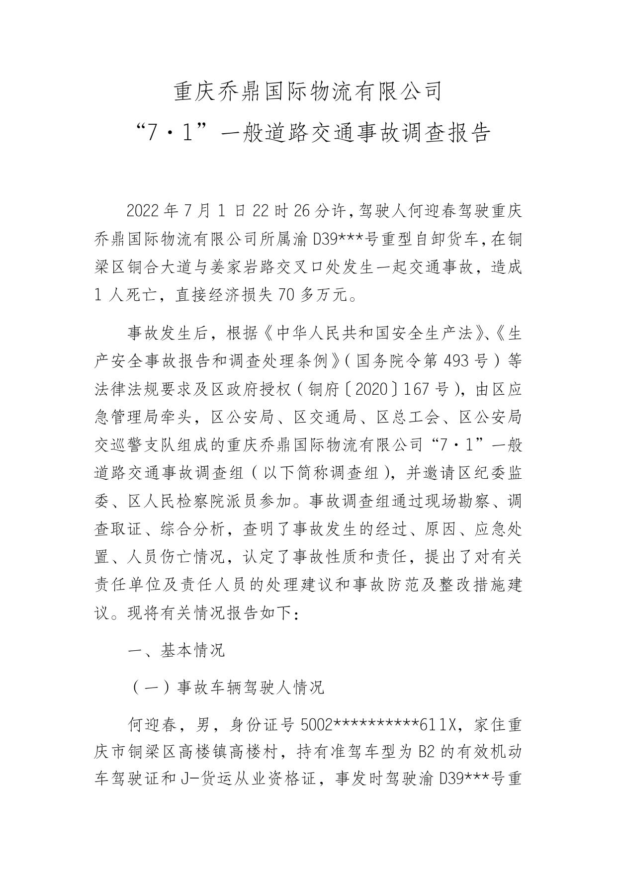 重庆乔鼎国际物流有限公司“7·1”一般道路交通事故调查报告.docx