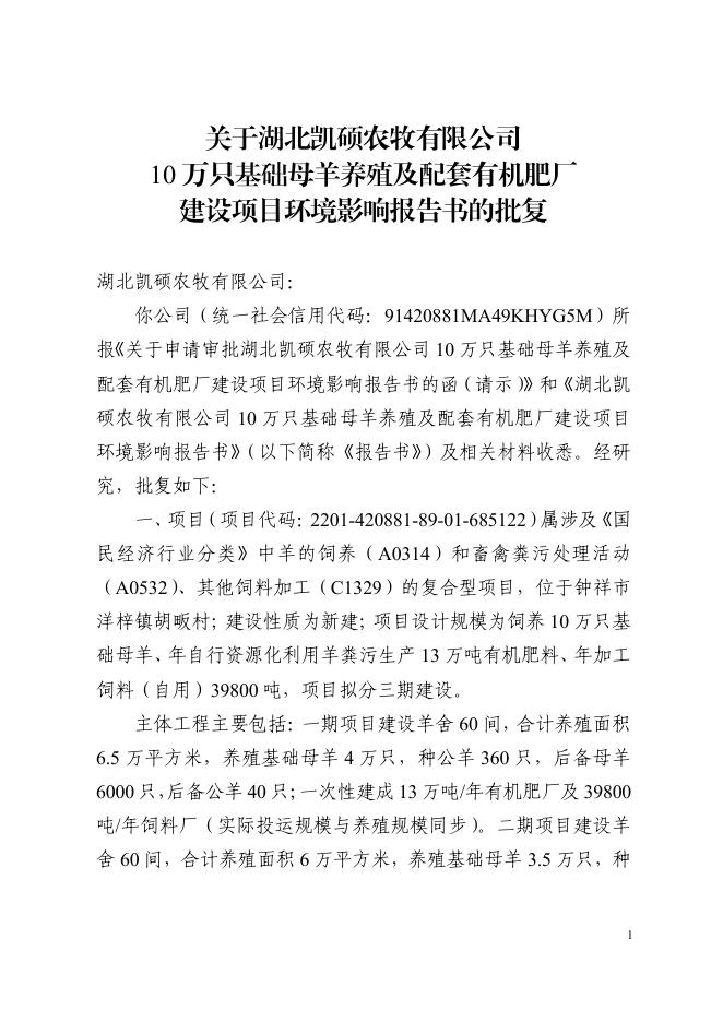 关于湖北凯硕农牧有限公司10万只基础母羊养殖及配套有机肥厂建设项目环境影响报告书的批复.pdf