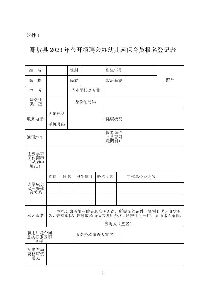 附件1:那坡县2023年公开招聘公办幼儿园保育员报名表.doc