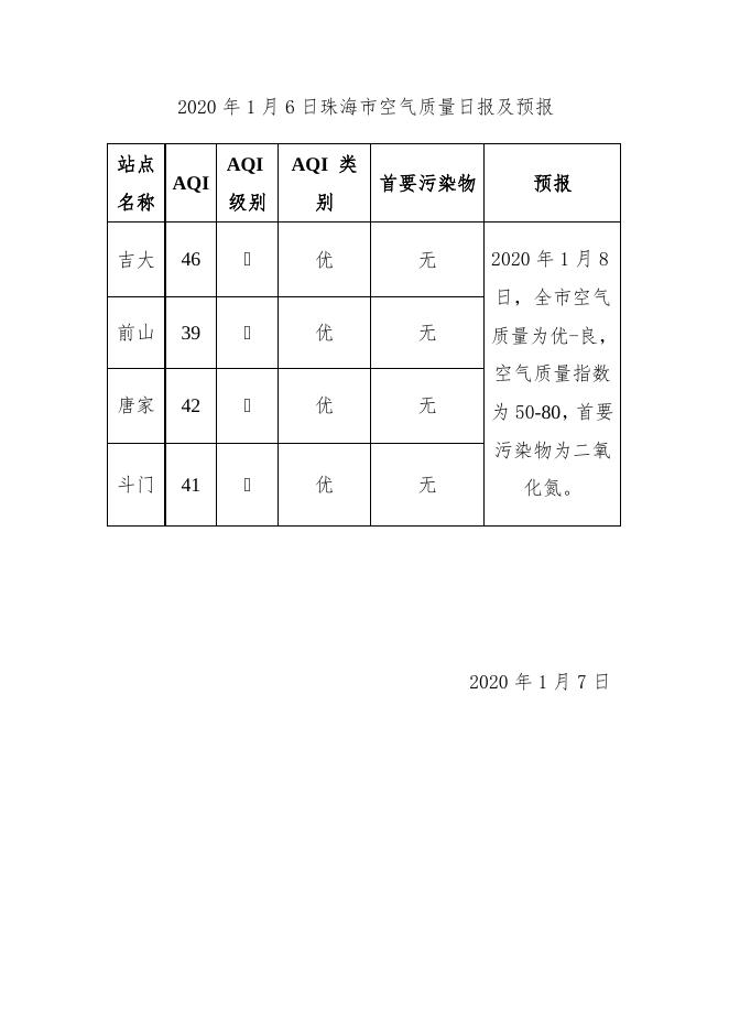 珠海市空气质量日报及预报2020-1-7.docx