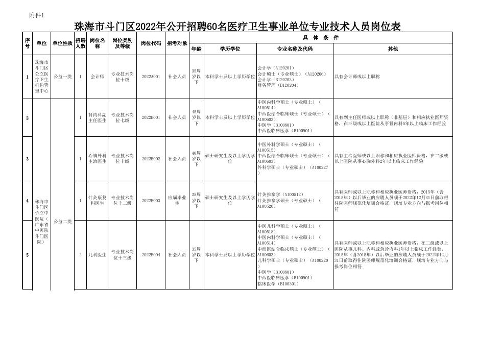 附件1:珠海市斗门区2022年公开招聘60名医疗卫生事业单位专业技术人员岗位表.xls