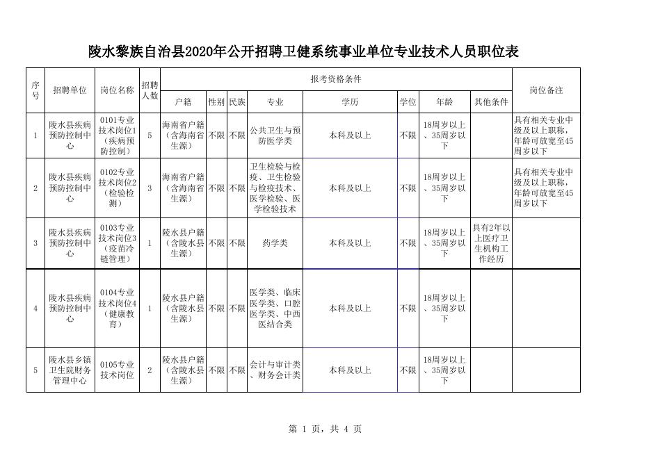 1.陵水黎族自治县2020年公开招聘卫健系统事业单位专业技术人员职位表.xls