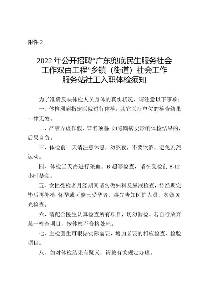 附件2:2022年公开招聘“广东兜底民生服务社会工作双百工程”乡镇(街道)社会工作服务站社工入职体检须知.doc