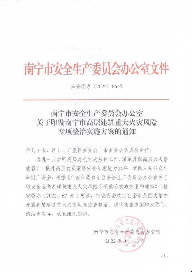 南安委办[2022]86号 关于印发南宁市高层建筑重大火灾风险专项整治实施方案的通知.pdf