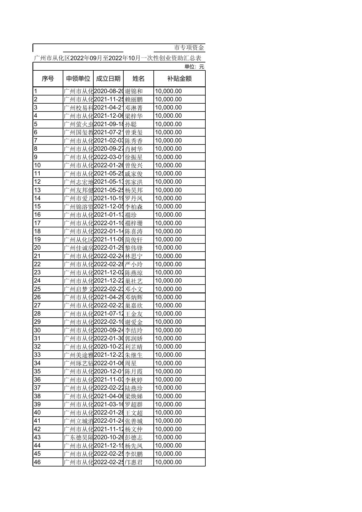 广州市从化区2022年09月至2022年10月一次性创业资助汇总表.xls