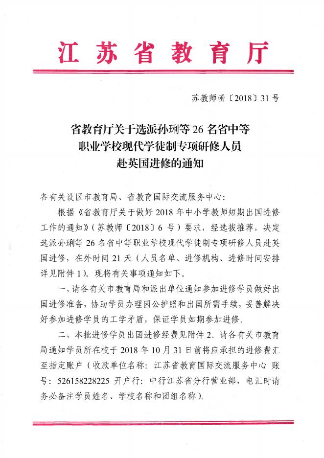 附件4:省教育厅关于选派孙琍等26名省中等职业学校现代学徒制专项研修人员赴英国进修的通知.pdf