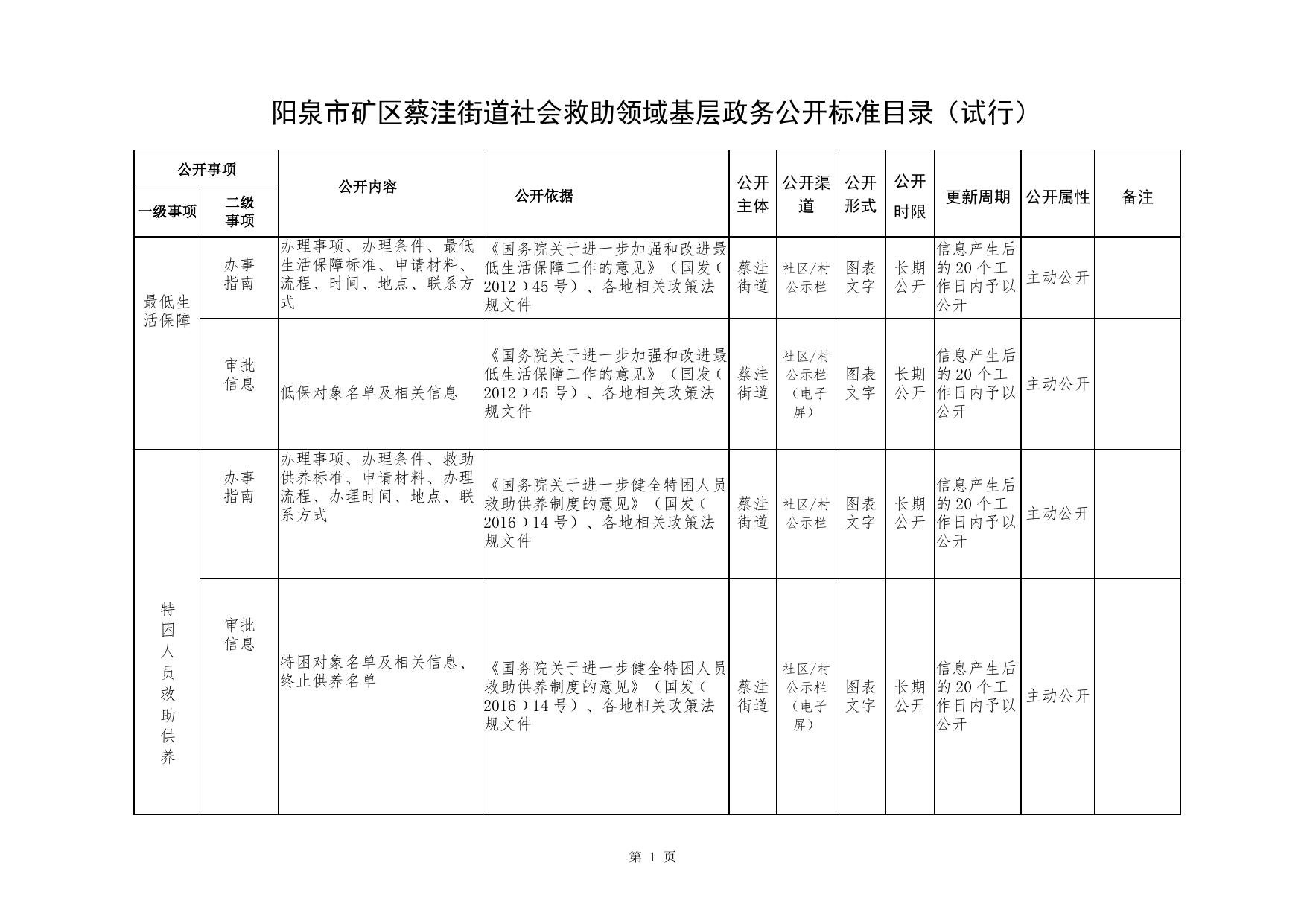 阳泉市矿区蔡洼街道社会救助领域基层政务公开标准目录.doc