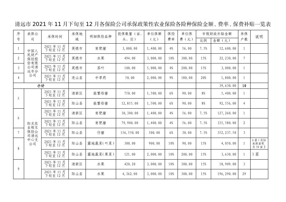 附件:清远市2021年11月下旬至12月各保险公司承保政策性农业保险各险种保险金额、费率、保费补贴一览表.pdf