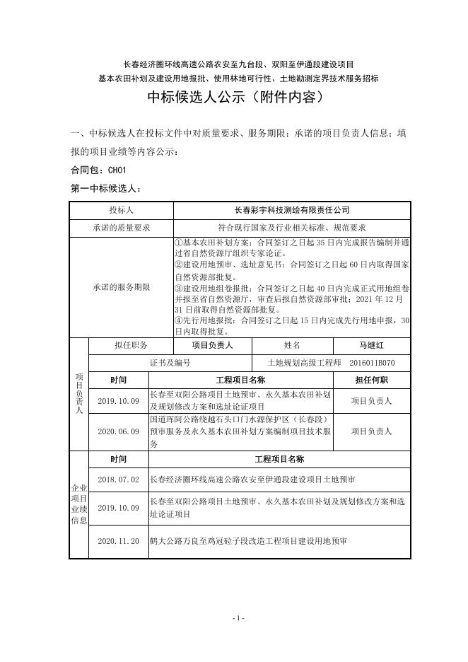 长春经济圈环线高速公路农安至九台段、双阳至伊通段建设项目基本农田补划及建设用地批报、使用林地可行性、土地勘测定界技术服务招标中标候选人公示(附件内容).pdf
