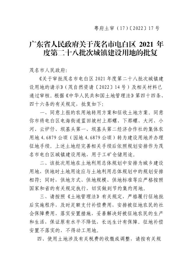 广东省人民政府关于茂名市电白区2021年度第二十八批次城镇建设用地的批复.pdf