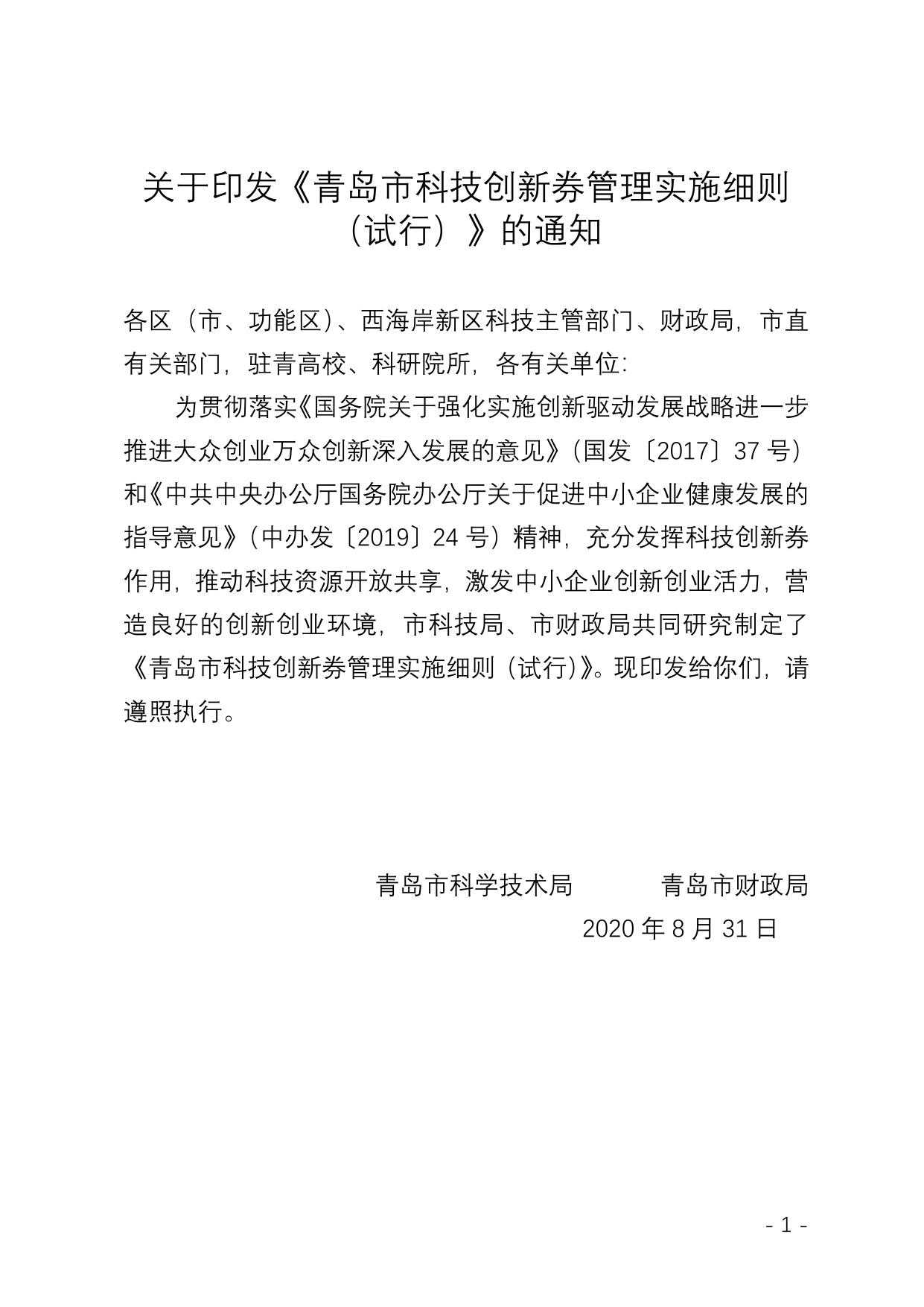 关于印发《青岛市科技创新券管理实施细则 (试行)》的通知.doc