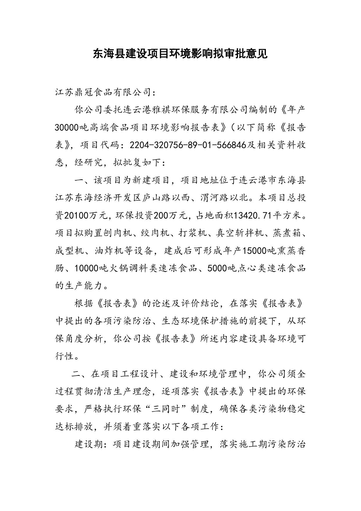 附件:江苏鼎冠食品有限公司年产30000吨高端食品项目拟批复意见.doc