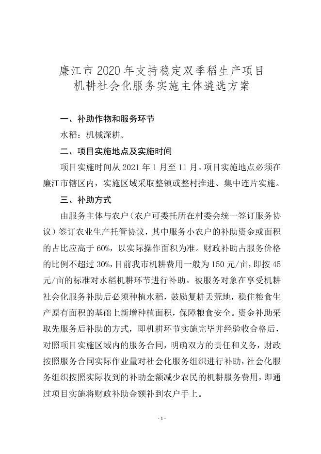 廉江市2020年支持稳定双季稻生产项目机耕社会化服务实施主体遴选方案.doc