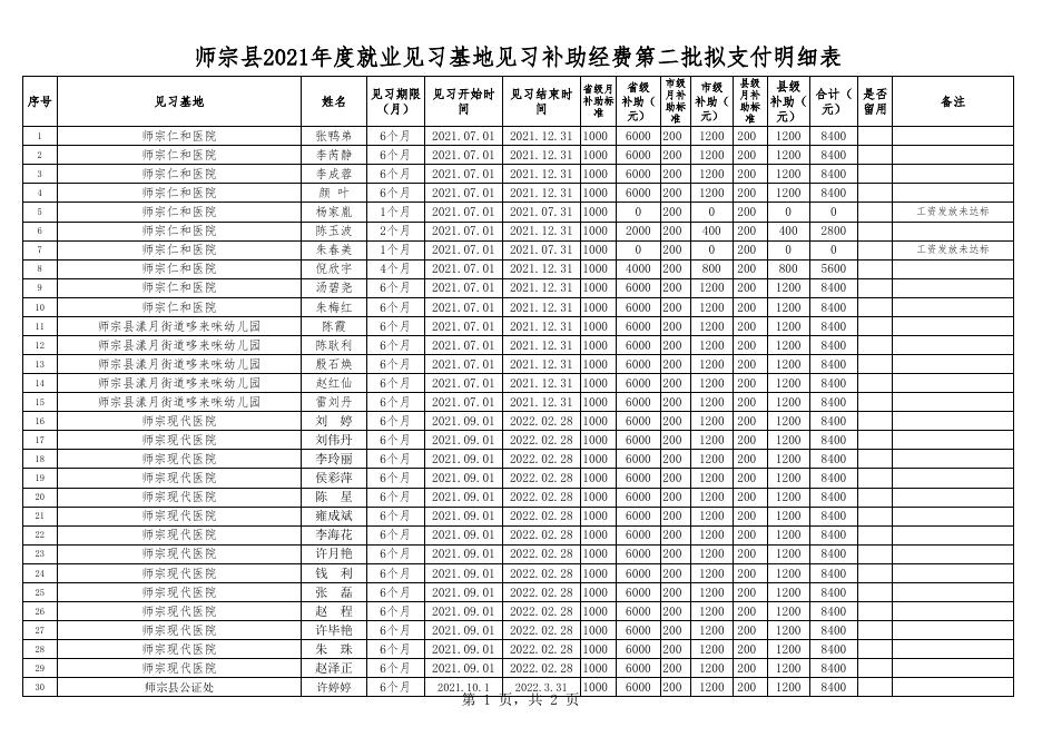 师宗县见习基地2021年度就业见习补助经费第二批拟支付明细表.xls
