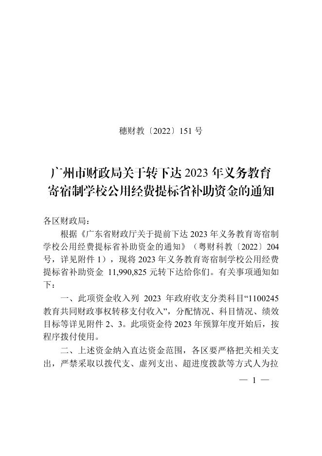 附件1:广州市财政局关于转下达2023年义务教育寄宿制学校公用经费提标省补助资金的通知.doc