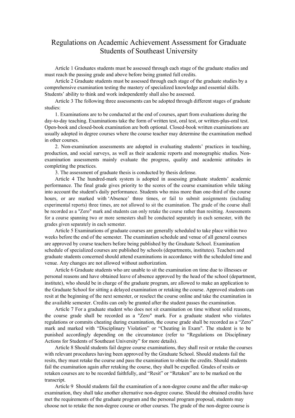 Regulations on Academic Achievement Assessment for Graduate Students of Southeast University