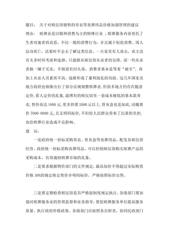 关于对殡仪馆销售的寿衣等丧葬用品价格加强管理的建议.doc