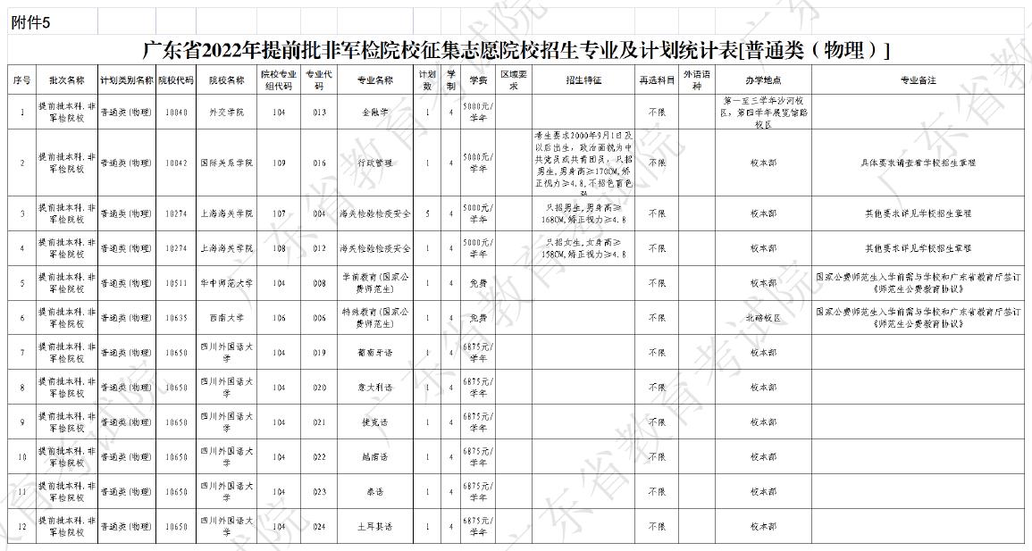 附件5:广东省2022年提前批非军检院校征集志愿院校招生专业及计划统计表【普通类(物理)】.pdf