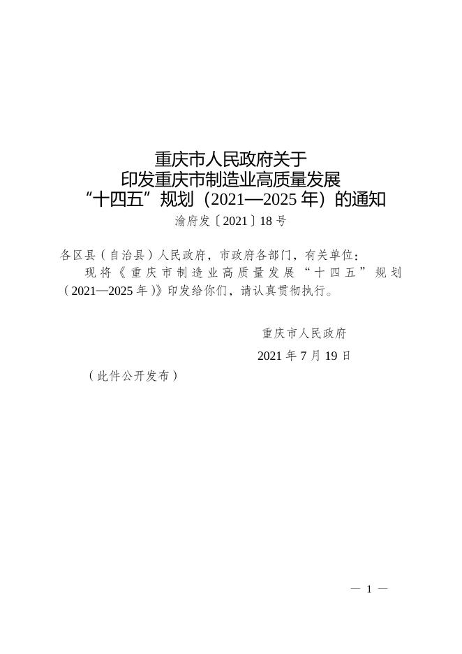 重庆市人民政府关于印发重庆市制造业高质量发展“十四五”规划(2021—2025年)的通知.doc