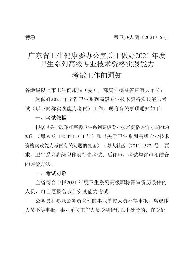 广东省卫生健康委办公室关于做好2021年度卫生系列高级专业技术资格实践能力考试工作的通知.docx
