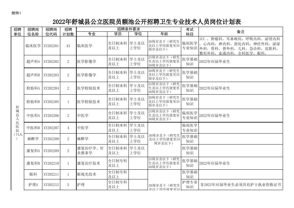 附件1:2022年舒城县公立医院员额池公开招聘卫生专业技术人员岗位计划表.xlsx