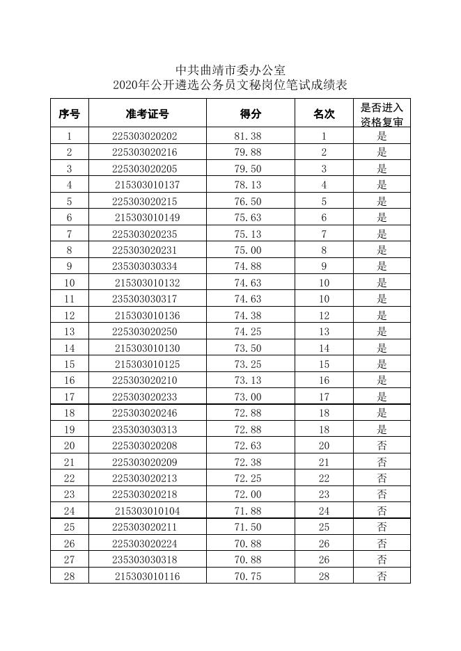 中共曲靖市委办公室2020年公开遴选公务员文秘岗位笔试成绩表.xlsx