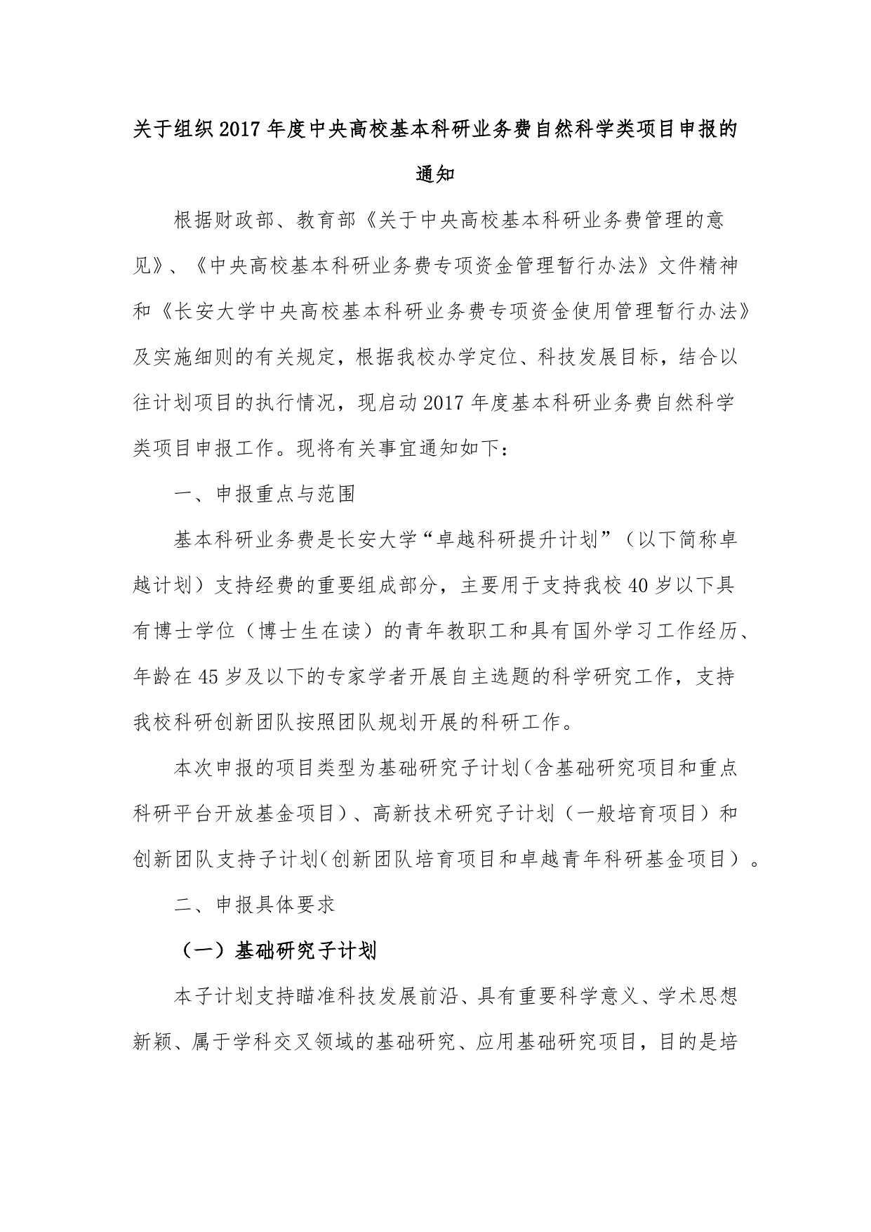 长安大学公路学院附件1.关于组织2017年度中央高校基本科研业务费自然科学类项目申报的通知.docx