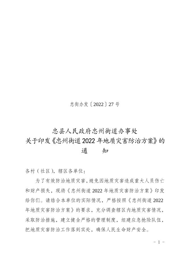 忠县人民政府忠州街道办事处关于印发《忠州街道2022年地质灾害防治方案》的通 知.doc
