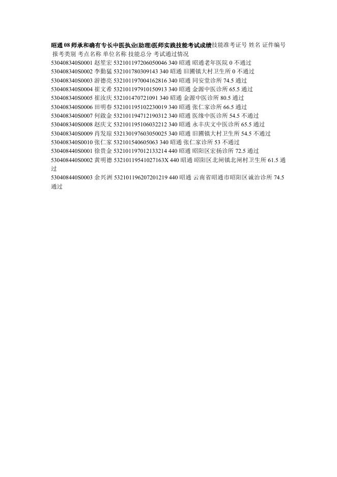 昭通2008年师承和确有专长中医执业(助理)医师实践技能考试成绩.doc