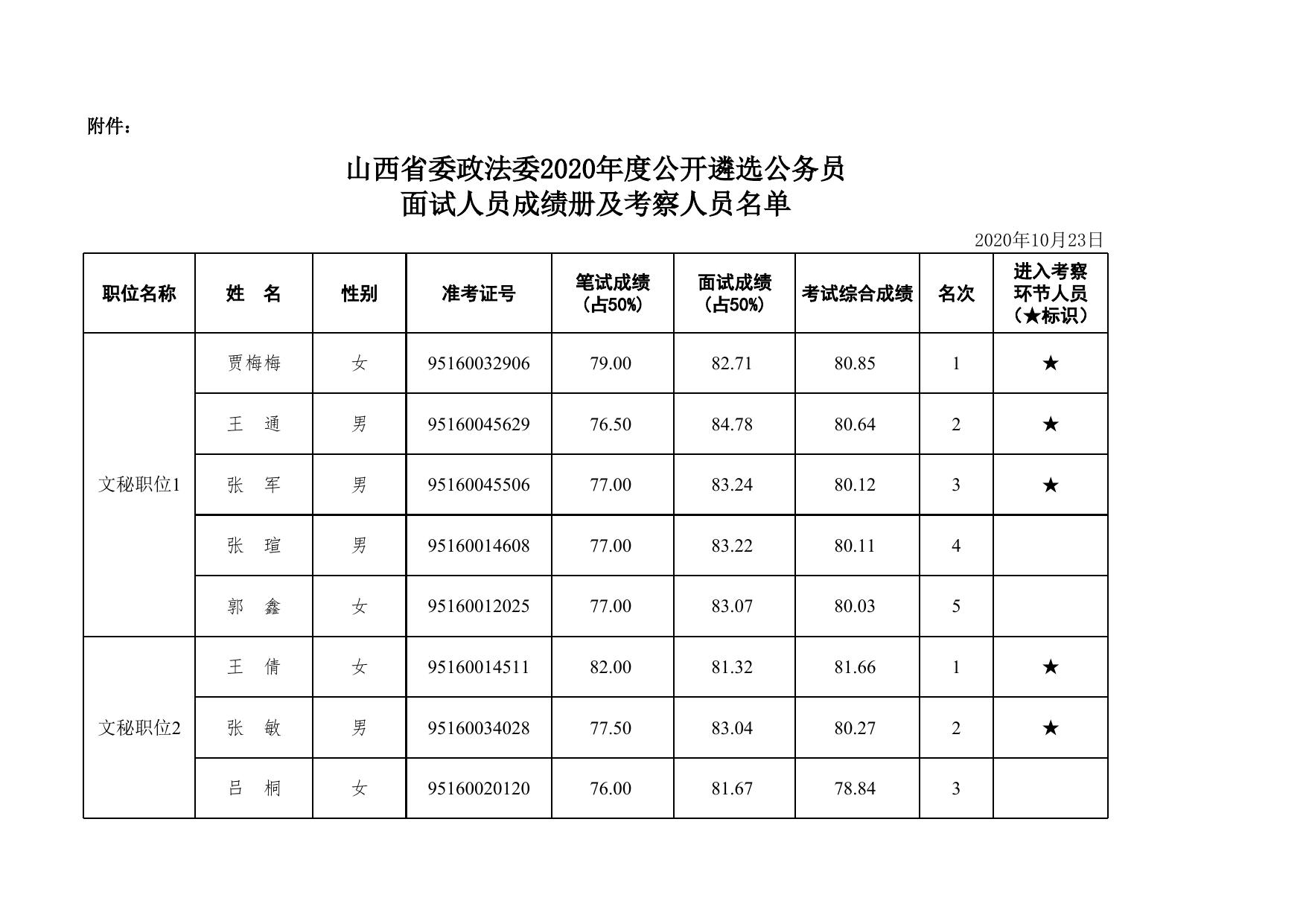 山西省委政法委2020年度公开遴选公务员面试人员成绩册及考察人员名单.xls