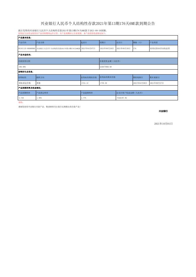 兴业银行人民币个人结构性存款2021年第13期176天6ME款到期公告.pdf