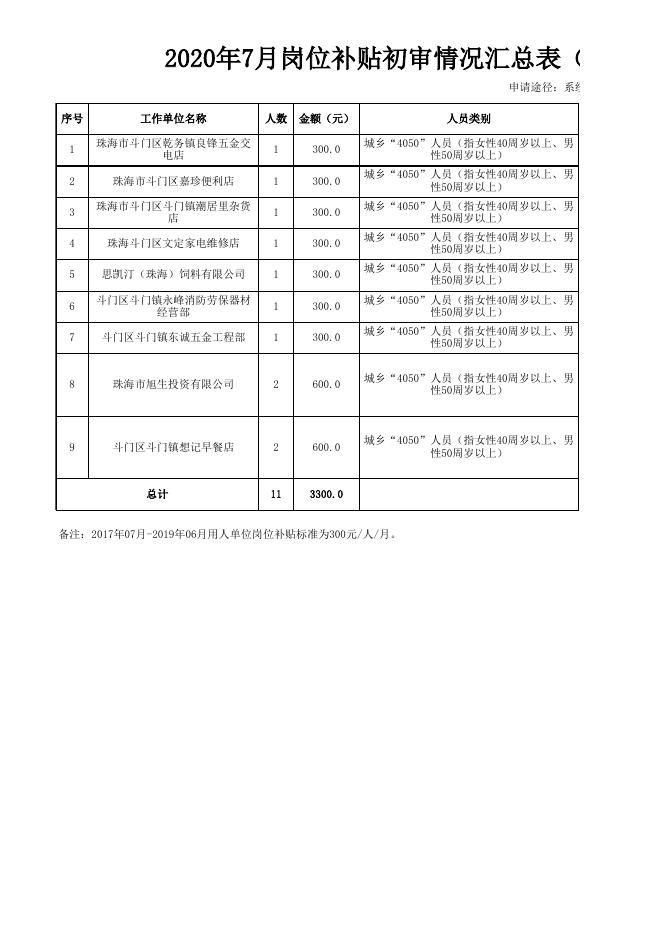 2020年7月岗位补贴初审情况汇总表(202014次资金会议).xls