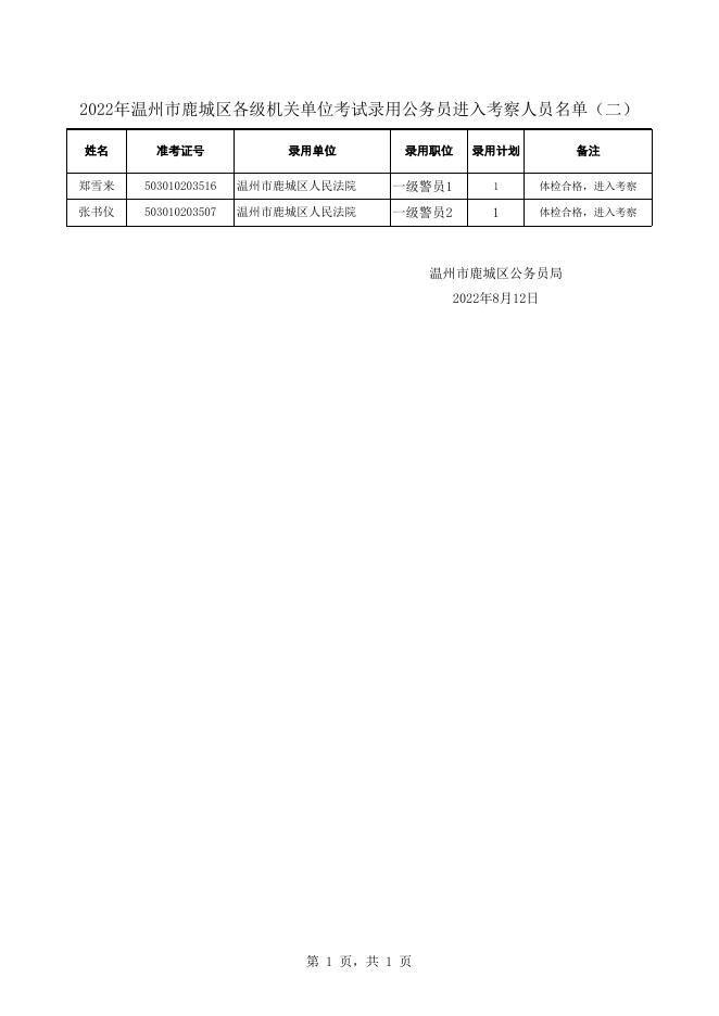 2022年温州市鹿城区各级机关单位考试录用公务员进入考察人员名单(二).xlsx